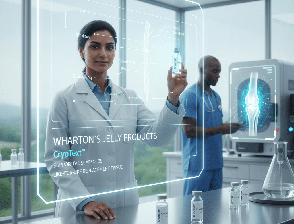 CryoText ™ Our Wharton’s jelly tissue products are human umbilical cord derived products that are rich in cytokines, growth factors, and scaffolding proteins. They are cryopreserved matrices suspended in sterile saline that act as supportive scaffolds for connective tissue repair. In other terms, they are u sed as like for like replacement tissue intended to replace missing or damaged connective tissue. Schedule an appointment today to see if you qualify for a Wharton’s jelly transplant.